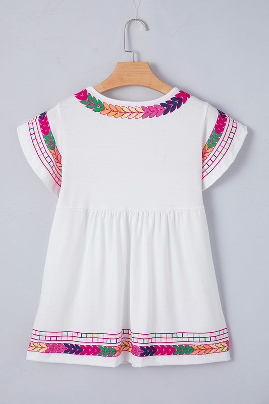 Ruffled Printed V-Neck Cap Sleeve Blouse