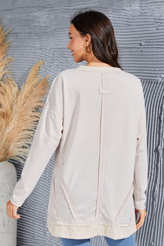 Exposed Seam V-Neck Long Sleeve Slit Sweatshirt