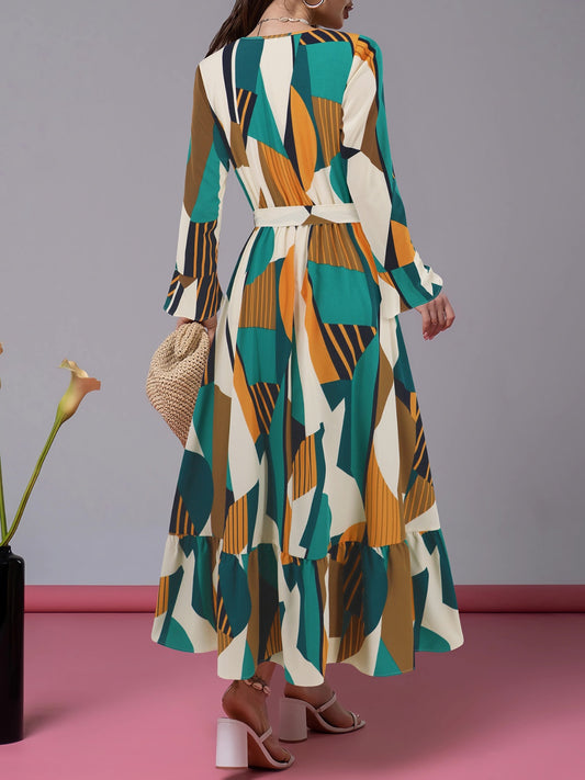 Ruffle Hem Tied Printed Long Sleeve Dress